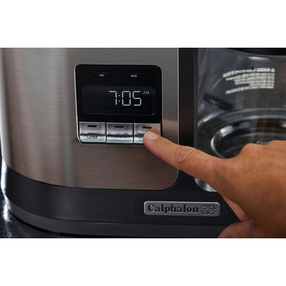 Provide delicious beverages for everyone with this Calphalon Special Brew 10-cup coffee maker in dark stainless steel. The premium boiling system extracts up to 20 percent more flavor. The nonstick warming plate keeps the 10-cup glass carafe warm for up to four hours, and the Delay Brew feature lets you select a brewing time in advance. The strength flavor adjustment feature in this Calphalon Special Brew 10-cup coffee maker ensures the coffee is to your preferred taste.
