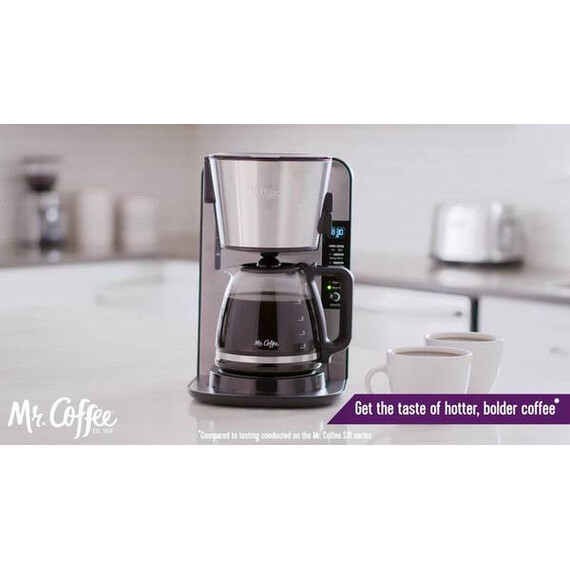 Prepare eye-opening hot beverages with this stainless steel Mr. Coffee programmable coffee maker. It has a flavor enhancer and precise water stream for evenly extracting flavor from grounds, and the warming plate keeps the carafe hot for leisurely mornings. This 12-cup Mr. Coffee programmable coffee maker has a two-hour automatic shutoff feature for added safety.