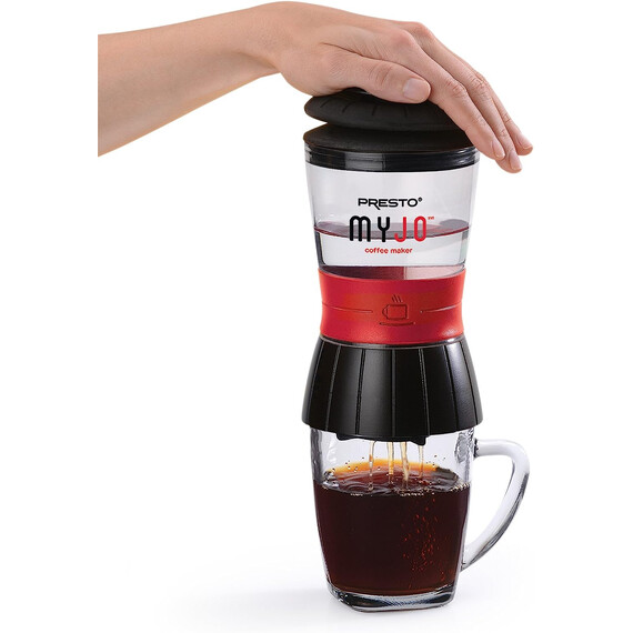 Brew coffee quickly with the Presto MyJo single-cup coffee maker. Load it with ground coffee, or pop in a single-serve pack and add hot water to enjoy your favorite type of coffee. The Presto MyJo single-cup coffee maker has a compact design and comes apart with ease, so you can take it anywhere.