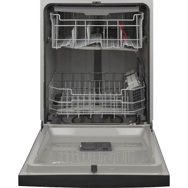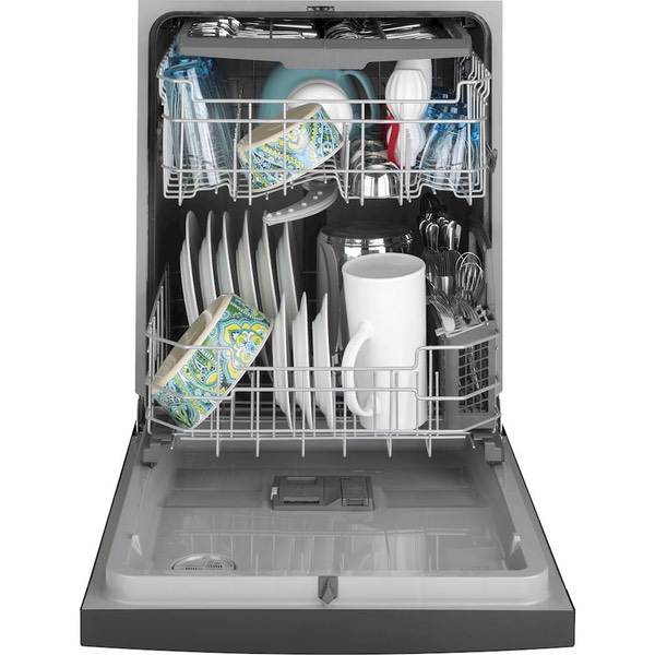 Enjoy cleaner dishes and utensils with this black GE dishwasher. It has a steam prewash that unsticks food particles and four bottle-wash jets to blast hard-to-reach places like tall glassware. This 24-inch GE dishwasher has Dry Boost that dries three times better than the standard cycle, leaving you with a spot-free load.
