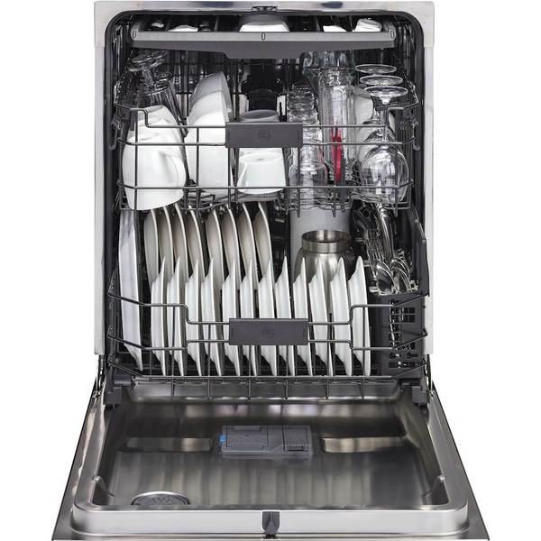 Complete your kitchen with this 24-inch GE dishwasher. The adjustable upper rack and lower rack with multi-position tines accommodate glassware and dishware for up to 16 place settings. This stainless steel GE dishwasher has four dedicated jets in the upper rack to thoroughly clean inside glasses and other tall items.