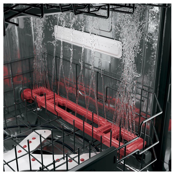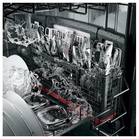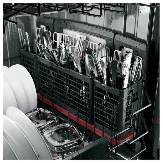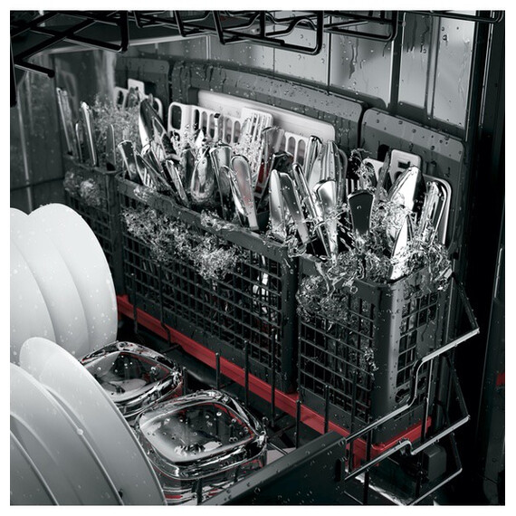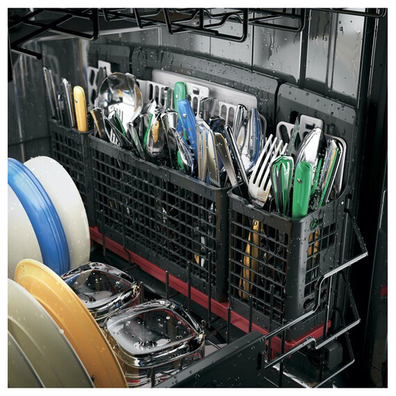 Simplify kitchen cleanup with this 24-inch GE dishwasher. It has room for up to 16 place settings, so it can handle large, heavily soiled loads, and its third rack provides a designated place for knives, measuring cups and small utensils. This black GE dishwasher coordinates with Amazon Alexa, so you can remotely control it with voice commands.