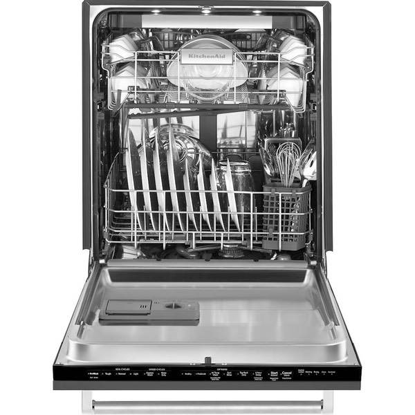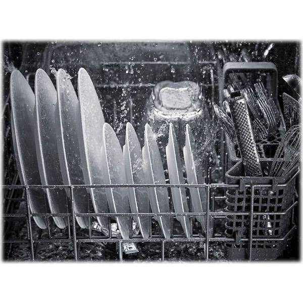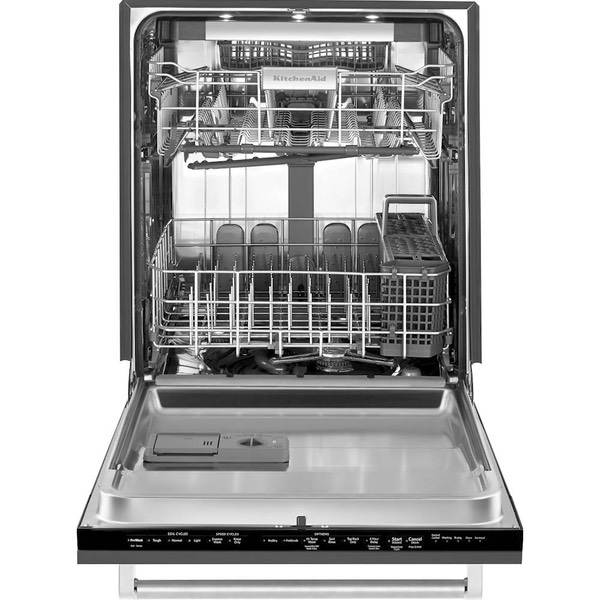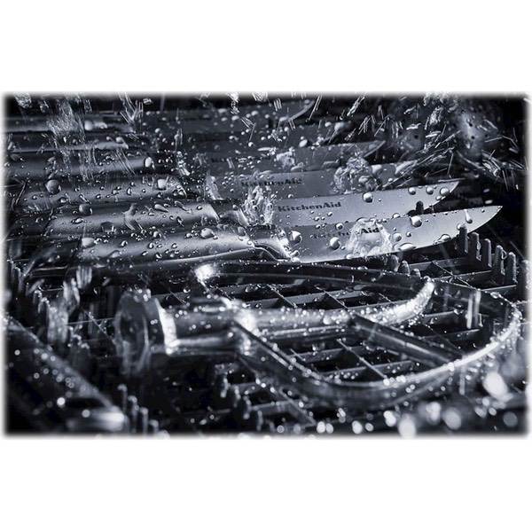 Match your cabinets for a smooth, finished look with this KitchenAid dishwasher. It delivers three times the water coverage with its nine wash arms, while the Clean Water Wash system removes food particles throughout the cleaning cycle. Combining a third-level rack for hard-to-fit items with fold-down tines in both the upper and lower racks, this KitchenAid dishwasher has space for every plate and utensil.