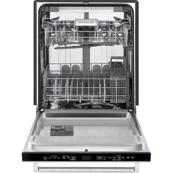 Load up this KitchenAid dishwasher with your after-party plates and pots for efficient, thorough cleaning. Dynamic Wash Arms ensure every surface is covered, while the Clean Water Wash system continuously removes food particles and dirt for a clean rinse. Featuring a pro-style design, this KitchenAid dishwasher boasts a third rack for handling hard-to-place utensils and tools.