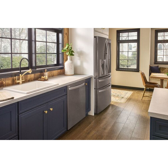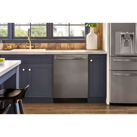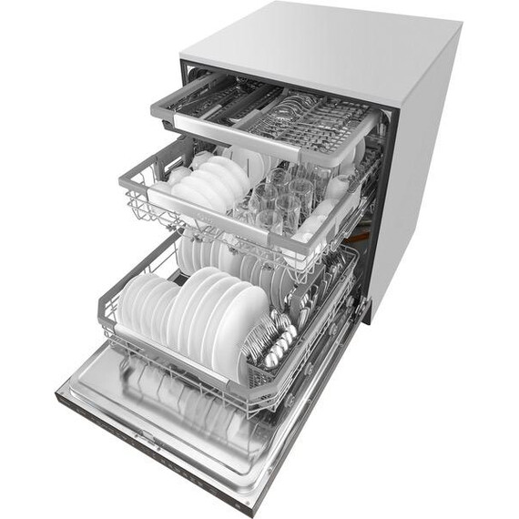 Handle large loads with this LG dishwasher. Its three racks pull out smoothly thanks to the glide rail technology, and the top rack has three height settings to accommodate taller items if needed. This LG dishwasher uses a four-armed QuadWash sprayer that moves to clean from multiple angles for thorough washing.