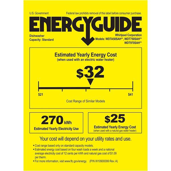 Simplify kitchen duties with this 5-cycle Whirlpool dishwasher. Its large-capacity interior is easy to load thanks to the adjustable top rack for tall items and the third rack for utensils. This energy-efficient Whirlpool dishwasher has a 47dBa sound rating and offers six control options for specific cleaning and drying needs.