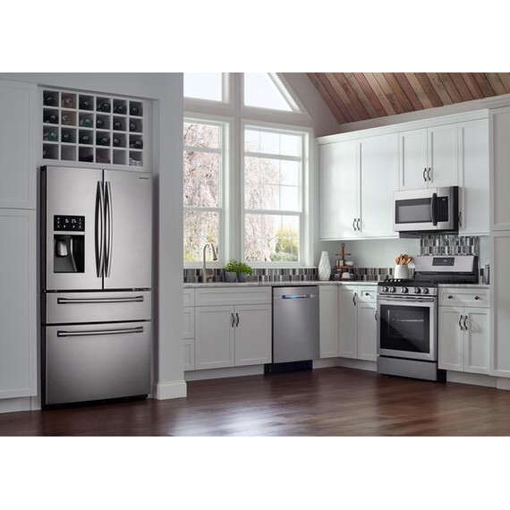 This sleek, yet spacious, over-the-range microwave looks beautiful in any kitchen. Its large display is brightly lit with a clean, ice-blue color for elegance and easy reading. This stainless steel microwave features intuitive controls and a variety of auto cook presets that save you time while preparing meals. It even features an Eco Mode that reduces energy consumption so you can save money, too.