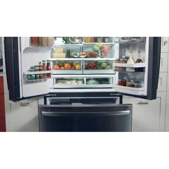 Store food in this GE stainless steel refrigerator to maintain longer freshness. This 27.7-cubic-foot refrigerator is built with TwinChill evaporators that separate climates in the fresh-food and freezer sections for optimal humidity and temperature levels. This GE stainless steel refrigerator has a door-alarm feature that notifies you when it is left open or partially closed.