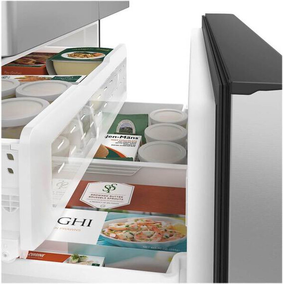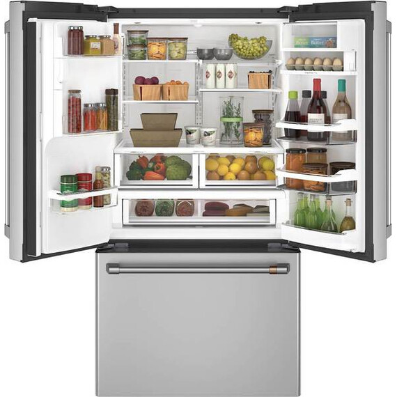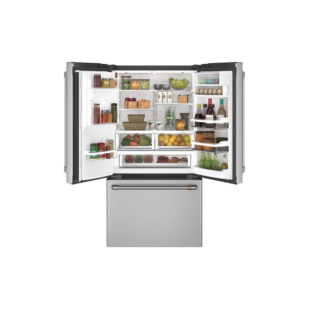 Give your kitchen a customized look with this counter-depth Café French door refrigerator. A convenient filtered hot water dispenser lets you make drinks and food items quickly with the push of a button. This 27.8 cu. ft. Café French door refrigerator has built-in Wi-Fi connectivity for working with various voice assistant applications.