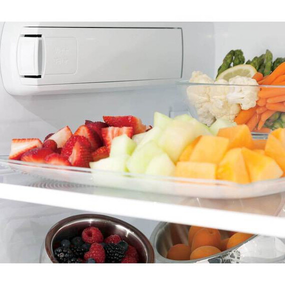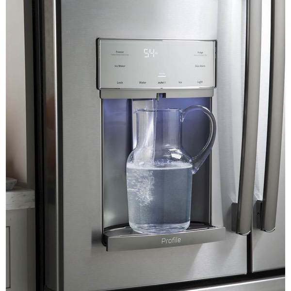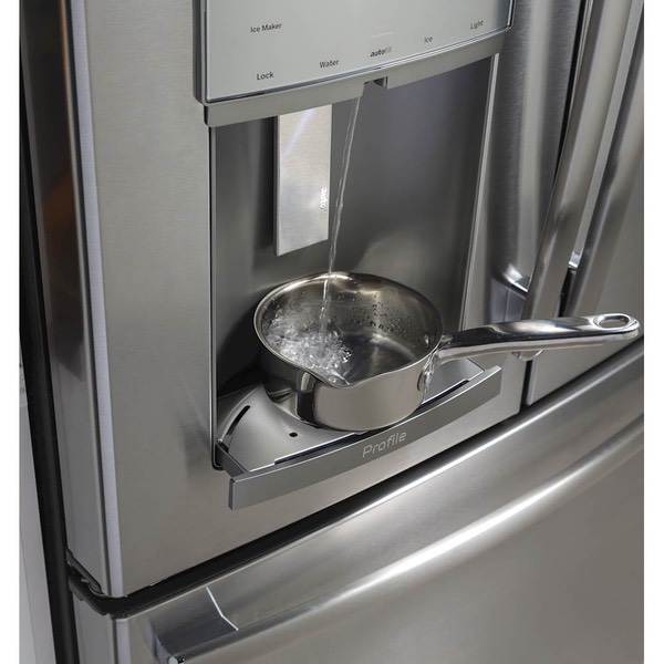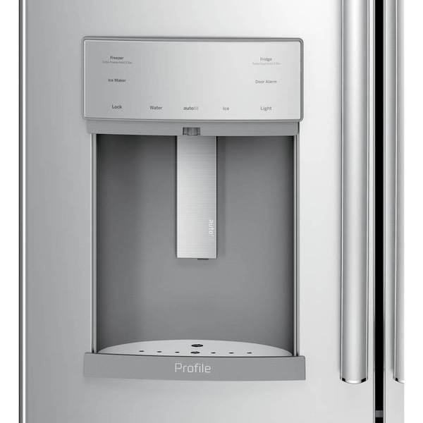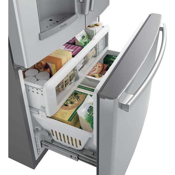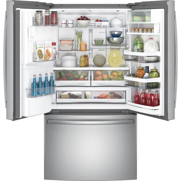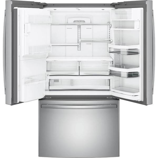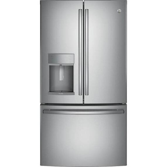 Cool food efficiently with this modern GE French-door refrigerator. This 22.2-cubic-foot unit has showcase lighting that illuminates the interior and an automatic in-door water dispenser to free up your hands so you can complete other tasks. The full-width drawer-style freezer of this GE French-door refrigerator has three temperature settings to optimize your food storage.