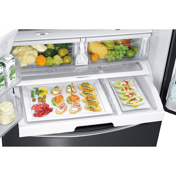 Samsung French door refrigerator: Organize your favorite fresh and frozen foods in this French door refrigerator, which offers a CoolSelect pantry with separate temperature controls to ensure customizable storage. LED lighting in the fresh-food and freezer sections helps you quickly find what you need.