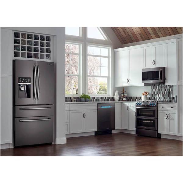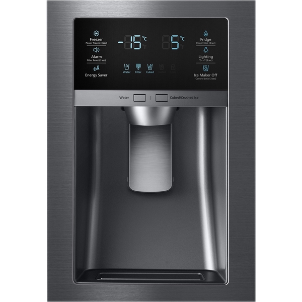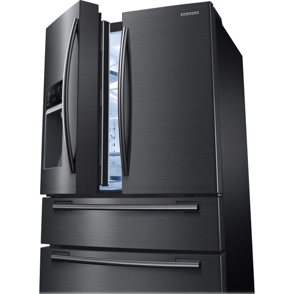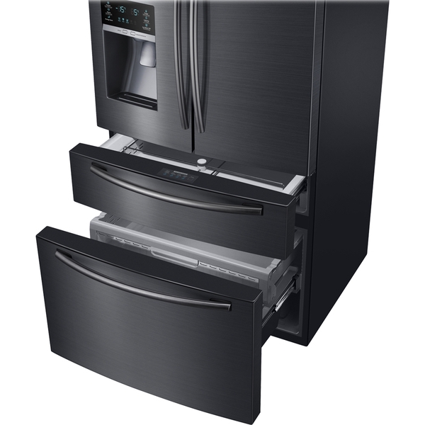 Introduce the bold look of black stainless steel to your kitchen with this Samsung French-door refrigerator. With a 25-cubic-foot capacity, this refrigerator offers more than enough storage for your family, and the Flex Zone drawer offers versatile storage for cold or frozen foods. Energy-efficient LED lighting illuminates every corner of this Samsung French-door refrigerator.