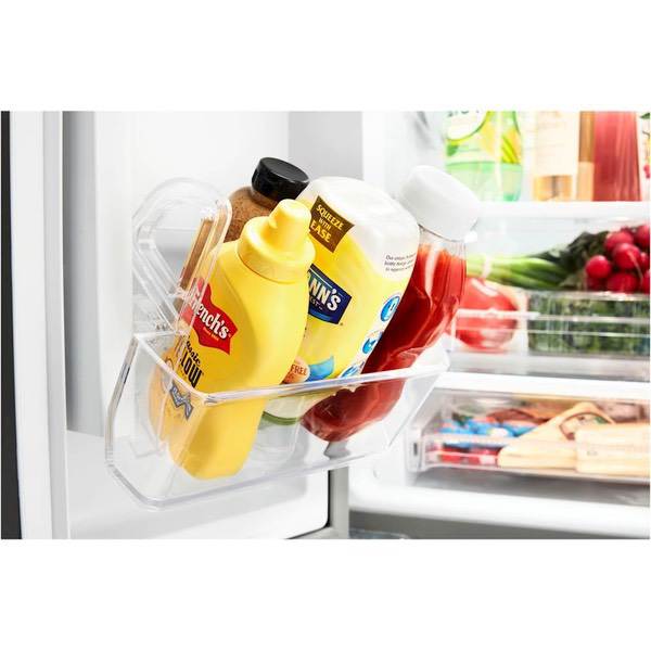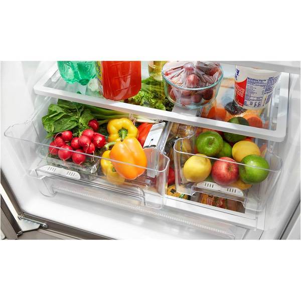 Preserve food quality and flavor with this Whirlpool 30-inch French door refrigerator. Its external water dispenser gives you access to a cold drink anytime, and the selectable humidity levels in the crispers let you choose ideal conditions for specific produce items. Alter storage space to fit your needs with the adjustable gallon door bins in this Whirlpool 30-inch French door refrigerator.