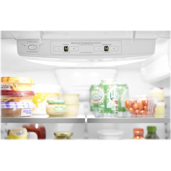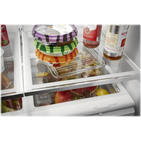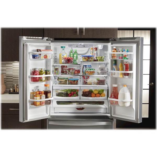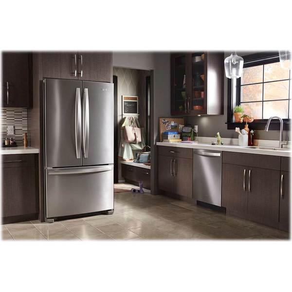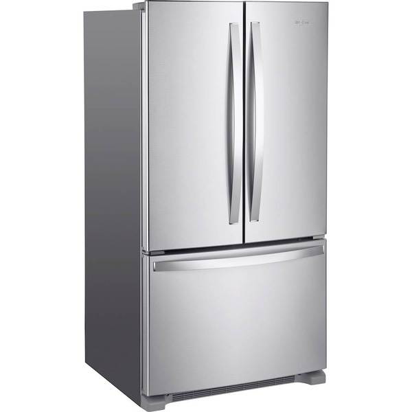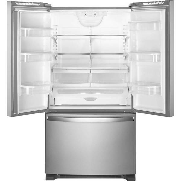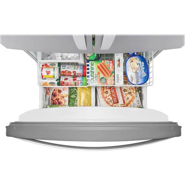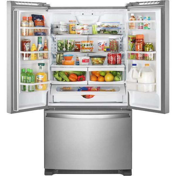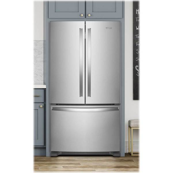 Keep food fresh with this Whirlpool French door refrigerator. Store items in bulk on the full-width pantry shelf or in the large refrigerator box or freezer, and find them easily thanks to the LED interior lighting. This stainless steel Whirlpool French door refrigerator has an Accu-Chill system for accurate temperature management.