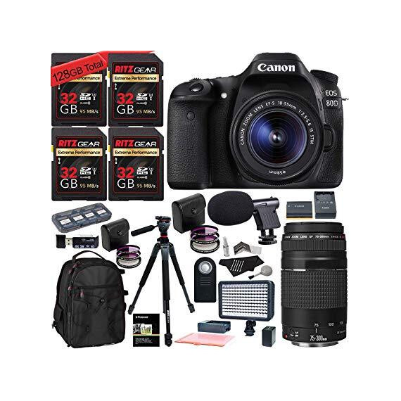 Canon EOS 80D DSLR 18-55mm is STM Camera Kit, 128 GB of Memory Cards (U3), 75-300mm Lens, Camera Bag, Ritz Gear 60" Tripod, Macro Lenses, 2 Filter Sets Warranty