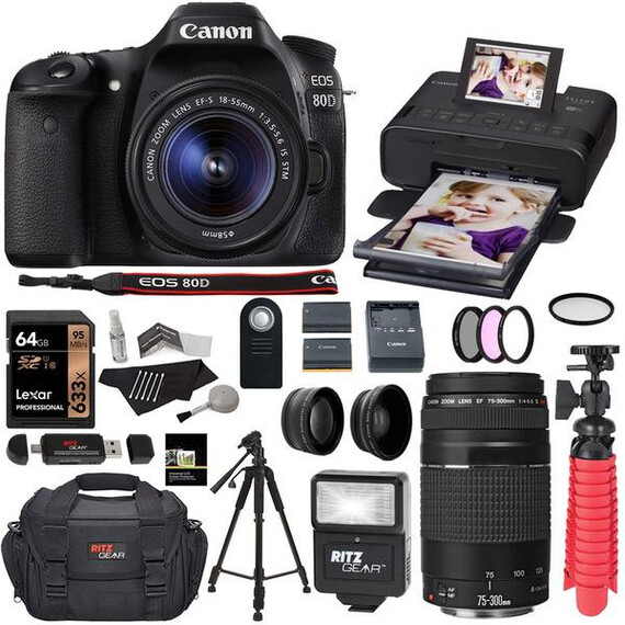 Canon EOS 80D DSLR Camera 18-55mm is STM Kit with EF-S 55-250 is STM Lens, Kodak Printer Dock, Printer Paper, Lexar 32GB U3 Memory Card Bundle