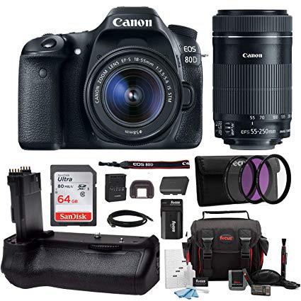 Canon EOS 80D DSLR Camera with EF-S 18-55mm f/3.5-5.6 is STM + EF-S 55-250mm f/4-5.6 is STM Lens + 64GB SD Card + Battery Grip Advanced Photo & Travel Bundle