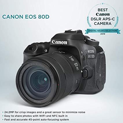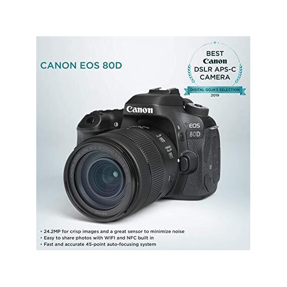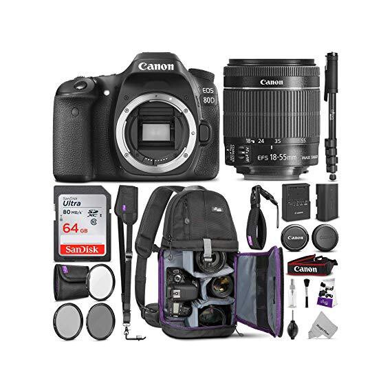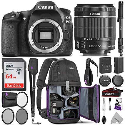 Make sure this fits by entering your model number. INCLUDES: Canon EOS 80D DSLR Camera with 18-55mm Lens + Altura Photo Sling Backpack + Altura Photo Compact 62-Inch Monopod + SanDisk 64GB Ultra UHS-I SDXC Memory Card (Class 10) + Altura Photo UV CPL ND4 Filter Kit + Altura Photo Neck Strap + Altura Photo Rapid Fire Wrist Strap + Altura Photo Cleaning Kit + MagicFiber Microfiber Cleaning Cloth. FEATURING a 24.2MP APS-C CMOS sensor and DIGIC 6 image processor, the 80D is capable of producing high-resolution imagery with notable clarity and minimal noise. FULL HD 1080p Video Recording, 45-Point All Cross-Type AF and Dual Pixel CMOS AF Systems, Body Design and Built-In Wi-Fi with NFC. CANON brand accessories included: Canon EOS 80D DSLR Camera + EF-S 18-55mm f/3.5-5.6 IS STM Lens + LP-E6N Lithium-Ion Battery Pack + LC-E6 Charger for LP-E6 Battery Pack + EW-EOS80D Wide Camera Strap + Eyecup Eb + RF-3 Body Cap + Canon Limited 1-Year Warranty CANON AUTHORIZED DEALER. Includes Canon USA Warranty.