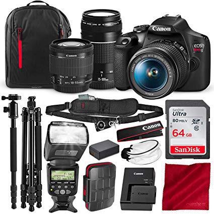 Make sure this fits by entering your model number. Authorized Dealer, Canon USA Warranty, 24.1 Megapixel CMOS sensor for higher-resolution, detailed, vibrant shots and DIGIC 4+ Image Processor for high-speed responsive performance Bright optical viewfinder and large 3.0" 920k-dot LCD monitor for live view shooting and image playback. Scene Intelligent Auto Mode Advanced 9-point AF with center cross-type point, ISO 100-6400 can be extended to 12800, and 3fps continuous shooting Built-in Wi-Fi and NFC technology for easy online sharing, EF-S 18-55mm f/3.5-5.6 IS II and EF 75-300mm f/4-5.6 III Lenses included Ready for professional shooting right out of the box with pro photo lighting and video accessories included in the Photo Savings value accessory pack (see description)
