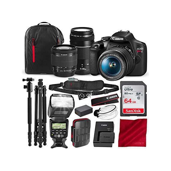 Canon T7 EOS Rebel DSLR Camera with 18-55mm and 75-300mm Lenses Kit and 67" Tripod/Monopod + AF Power Zoom Flash + 64GB SD Card Pro Photo Travel Bundle