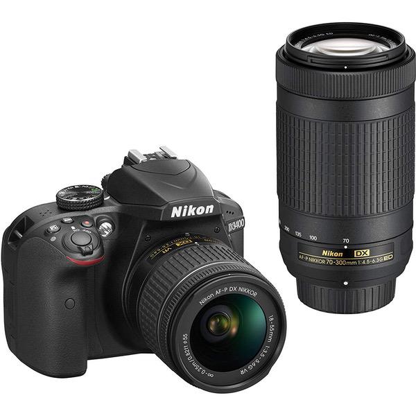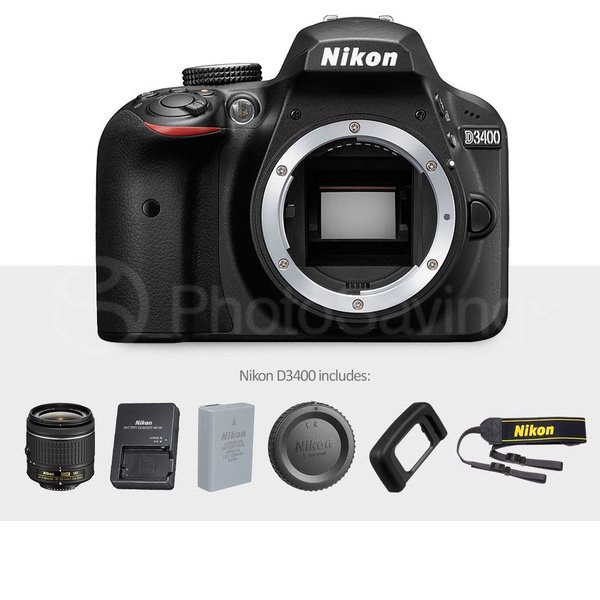 Make sure this fits by entering your model number. Bundle Includes - Nikon D3400 24.2MP DSLR Camera w/ 18-55 and 70-300 lens / 64GB Memory Card / Telephoto Lens / Wide Angle Lens / 3-Piece Filter Kit / Digital Slave Flash / Wireless Shutter Release / 58" Tripod / DSLR Accessories Bundle with Bag Nikon Authorized Dealer - Includes USA Manufacturer's Warranty 24.2MP DX-Format CMOS Sensor / EXPEED 4 Image Processor / No Optical Low-Pass Filter Native ISO 100-25600; 5 fps Shooting / 3.0" 921k-Dot LCD Monitor / Full HD 1080p Video Recording at 60 fps Multi-CAM 1000 11-Point AF System / SnapBridge Bluetooth Connectivity / AF-P DX 18-55mm f/3.5-5.6G VR Lens / AF-P DX 70-300mm f/4.5-6.3G ED Lens