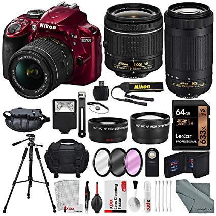 Make sure this fits by entering your model number. Bundle Includes - Nikon D3400 24.2MP DSLR Camera w/ 18-55 and 70-300 lens / 64GB Memory Card / Telephoto Lens / Wide Angle Lens / 3-Piece Filter Kit / Digital Slave Flash / Wireless Shutter Release / 58" Tripod / DSLR Accessories Bundle with Bag Nikon Authorized Dealer - Includes USA Manufacturer's Warranty 24.2MP DX-Format CMOS Sensor / EXPEED 4 Image Processor / No Optical Low-Pass Filter Native ISO 100-25600; 5 fps Shooting / 3.0" 921k-Dot LCD Monitor / Full HD 1080p Video Recording at 60 fps Multi-CAM 1000 11-Point AF System / SnapBridge Bluetooth Connectivity / AF-P DX 18-55mm f/3.5-5.6G VR Lens / AF-P DX 70-300mm f/4.5-6.3G ED Lens