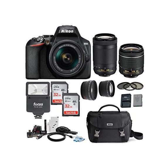 Make sure this fits by entering your model number. BUNDLE INCLUDES: Nikon D3500 DX-Format DSLR Camera with AF-P 18-55mm VR and 70-300mm Lenses, (2) SanDisk Ultra 32GB 80MB/s SD Card, Focus FC-3000 Digital Slave Flash, 55mm UV/CPL/ND Filter Kit, 55mm 2.2 Telephoto Lens, 55mm 0.43 Wide Angle Lens, Nikon DSLR Value Pack and Focus Accessories CMOS SENSOR: 15 times larger than a smartphone, and Nikon’s signature EXPEED image processing system, you will have extremely high resolution photos that take in more light and deliver truer color 18-55MM VR LENS: Conquer every landscape, video, or wide-angle shot, with a pulse motor for ultra-fast, near silent autofocus, you will always stay on your subject 70-300MM ED LENS: A super telephoto lens designed to bring those hard to shoot, far away subjects closer to life, with an ultra fast pulse motor powering the powerful and silent AF NIKON Authorized Dealer – Includes USA Manufacturer’s Warranty