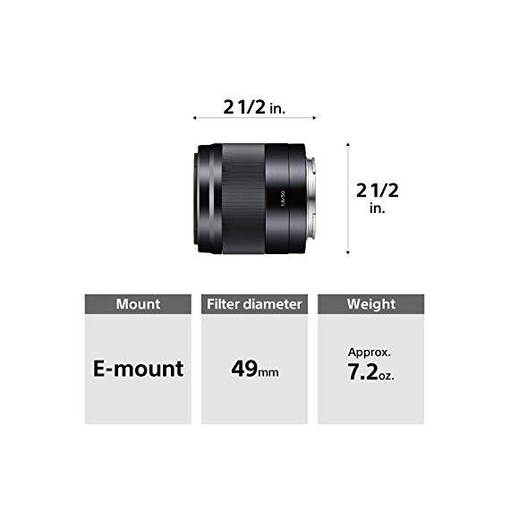 Make sure this fits by entering your model number. Built-in Optical SteadyShot image stabilization and 7-blade circular aperture for beautiful defocus effects Minimum Focus Distance : 1.28 ft (0.39 m), Maximum Magnification ratio : 0.16x, Focal-Length : 50 mm and filter diameter (mm) is 49 mm Large F1.8 maximum aperture enables beautiful defocusing effects. Angle of View (APS-C) : 32° "Compact, lightweight mid-range telephoto prime with elegant aluminum alloy exterior.Diaphragm Blades 7, Rounded" In-the-box: Hood (ALC-SH116), Lens front cap, Lens rear cap