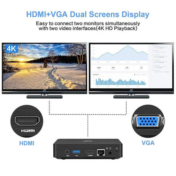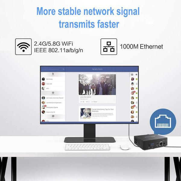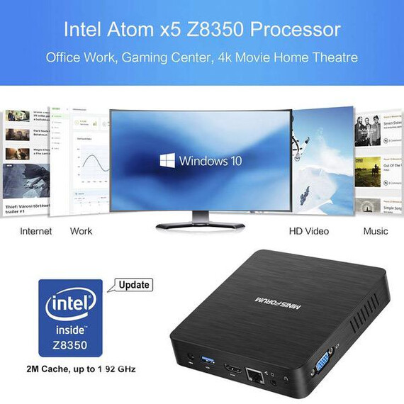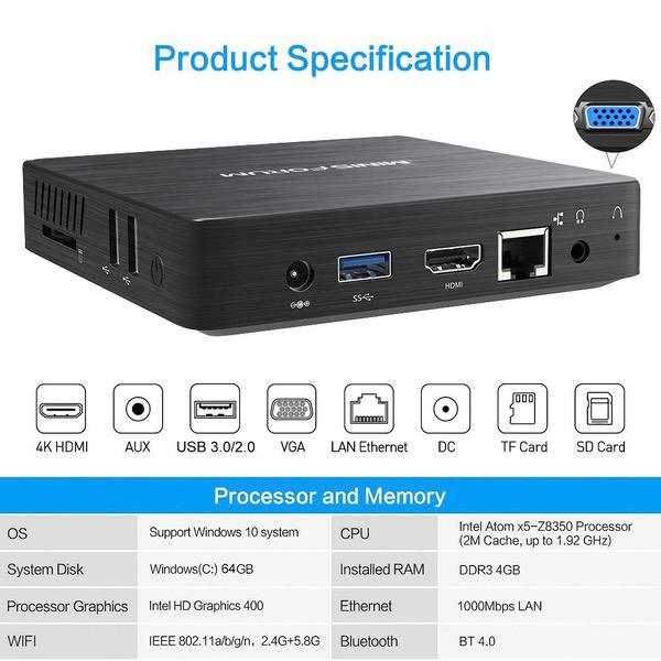 Fanless Mini PC, Intel x5-Z8350 HD Graphics Desktop Mini Computer Windows 10 Pro(64bit), DDR3L 2GB 32GB eMMC Built-in 2.4G/5G WiFi/BT 4.2/1000M LAN/HDMI/VGA Dual Output