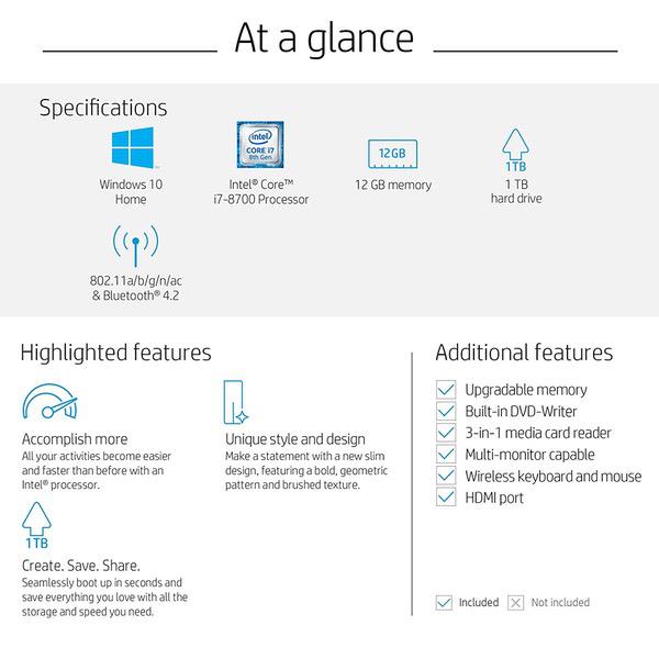Make sure this fits by entering your model number. Processor: 8th Generation Intel(R) Core(TM) i7-8700 Processor, 6-Core, 3.20GHz. Memory: 12 GB DDR4-2666 SDRAM (upgradable to 32 GB). Hard drive: 1 TB 7200RPM SATA. Operating system: Windows 10 Home. Ports: Headphone/Microphone Combo, 2 USB 3.1 Gen 1 (front), 1 USB 3.1 Gen 1 Type-C(TM) (front), 4 USB 2.0 (rear), 2 USB 3.1 Gen 1 (rear), HDMI Out (rear), VGA (rear), 10/100/1000 Base-T Network, and an HP 3-in-1 Media Card Reader. Keyboard and mouse: HP wireless keyboard with volume control and optical mouse.
