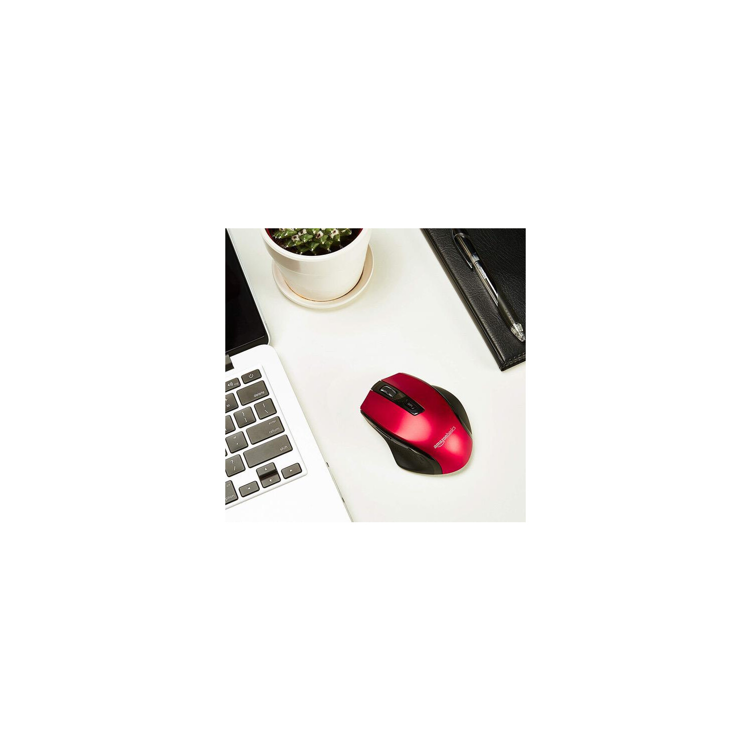 Make sure this fits by entering your model number. Compact wireless mouse with adjustable DPI for preferred sensitivity (600, 1000, 1600, 2400, or 3600 DPI) Advanced optical sensor; works on most surfaces; clickable metallic scroll wheel; back/forward thumb buttons for easily navigating web pages 2.4 GHz wireless connection with a 33-foot range; uses AES-128 encryption for added security; this mouse uses a small USB receiver that can stay plugged into your computer without obstructing other ports Ergonomic shape with rubberized sides ensures a comfortable hold; compatible with Windows 7, 8, and 10; uses 1 AA battery (included); bold Red color Measures 4.1 by 2.9 by 1.5 inches; backed by an AmazonBasics 1-year limited warranty