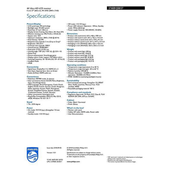 Make sure this fits by entering your model number. Philips 27" Led monitor with ultra clear 4K UHD (3840x2160) resolution with 10-bit IPS panel producing 1. 074 billion colors for smooth color gradations and detail Elegant, slim design with narrow Border Display for a seamless appearance Multitier enables active Dual connect and view at same time DisplayPort 1. 2, HDMI 2. 0 (x2) inputs with HDMI audio-out for convenience Less eye fatigue with flicker-free technology with low Blue mode for Easy on-the-eyes productivity