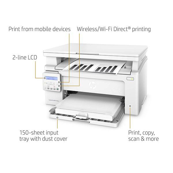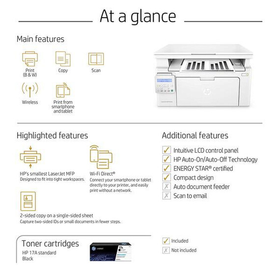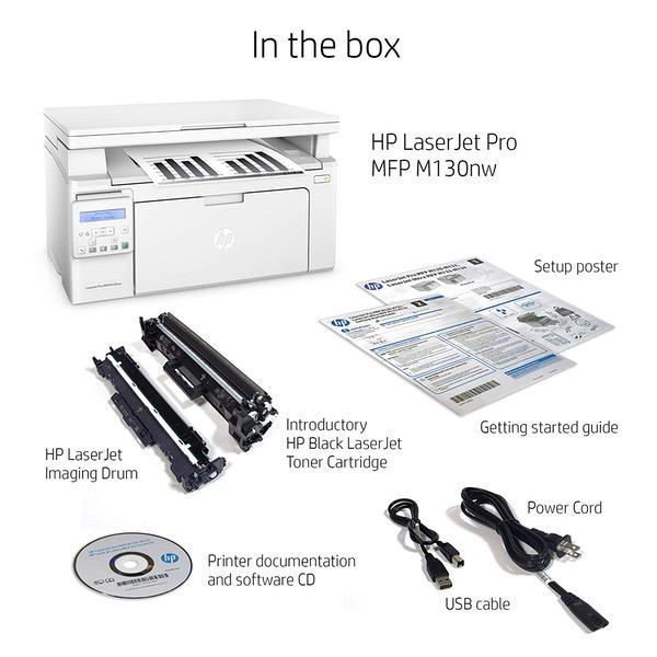 Make sure this fits by entering your model number. Main functions of the HP M130nw laser printer: monochrome print, scanner, copier, wireless printing, LCD display, Ethernet network connectivity, and more This HP M130nw laser printer replaces the HP M125nw printer, additionally the newer HP M130nw has 10% faster print speed plus improved mobile printing experience Prints up to 23 pages per minute, input tray paper capacity up to 150 sheets, duty cycle up to 1,500 pages per month Mobile printing: Use the HP Smart app to easily set up your printer, scan business documents with your mobile camera, and print through online services like Google Drive or Dropbox. Print also using AirPrint, Google Cloud Print or Wi-Fi Direct printing Keep things simple with HP’s smallest laser all in one. Print professional documents from a range of mobile devices, plus scan, copy, and help save energy with a wireless laser printer designed for efficiency Original HP Toner cartridges with JetIntelligence - engineered to help your printer print faster and more pages Choose Original HP 17A Toner cartridges specially designed to work with your printer and avoid frustrating reprints, wasted supplies, and delays Ideal for home and small to medium businesses with work groups of 1-5 users. One-year limited hardware warranty