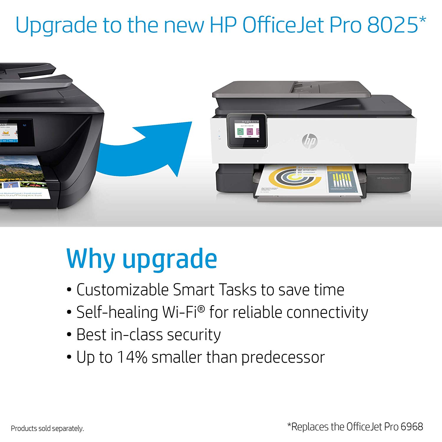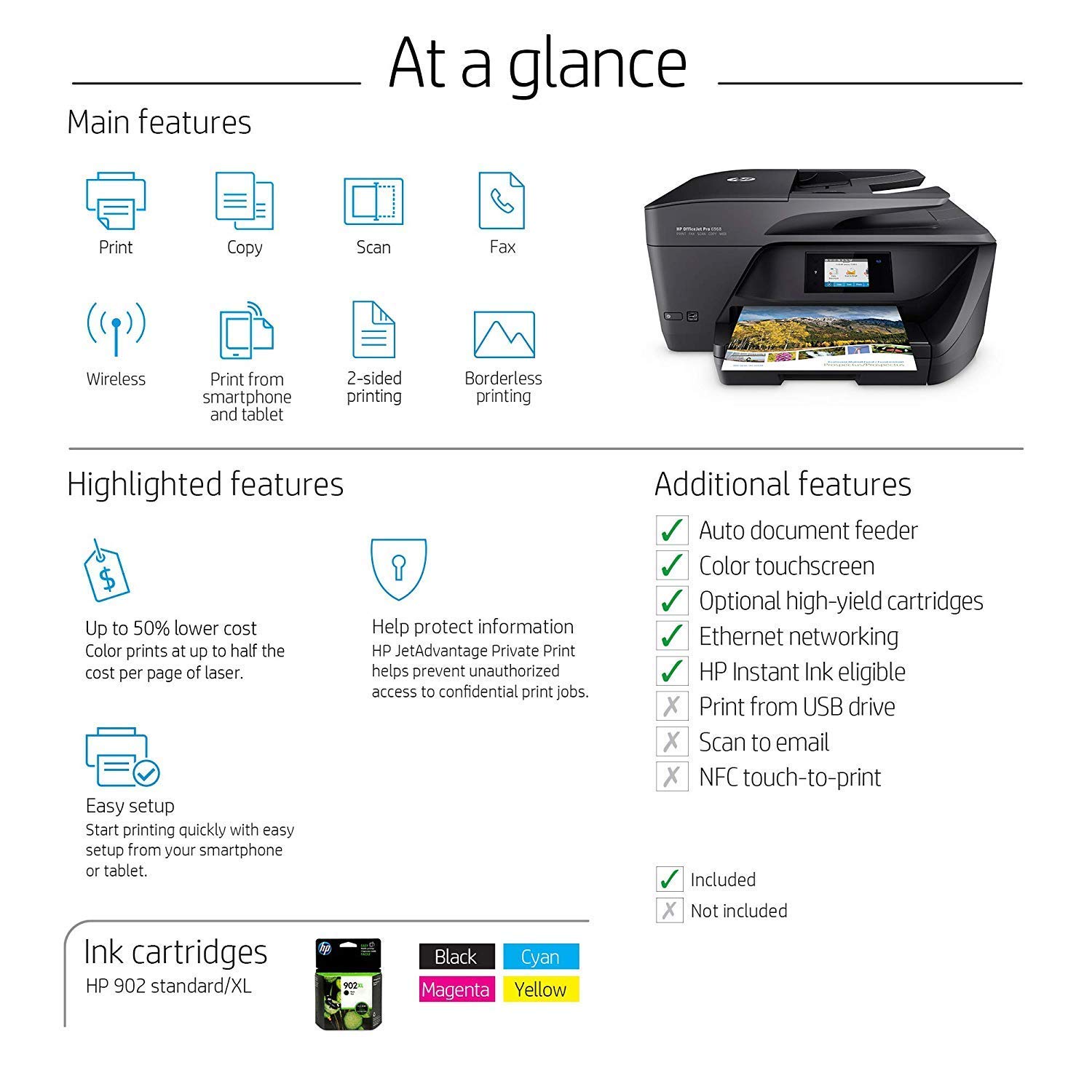Make sure this fits by entering your model number. Main functions of this HP color inkjet photo printer: copy, scan, fax, wireless printing, two-sided duplex printing, color touchscreen, automatic document feeder, Instant Ink ready so you'll never run out of ink, and more Easily print when and where you need to from your smartphone, tablet, or notebook PC. Get convenient mobile printing options and mobile setup. Connect the way you want to with Ethernet and wireless networking Built for business. Produce fast professional-quality color for 50% less than lasers, save paper, and handle more tasks without slowing down HP OfficeJet Pro 6968 is ideal for the home office or small workgroups that need professional-quality, affordable color with powerful productivity and fast functionality Choose an ink replenishment service - Save up to 50% with HP Instant Ink or Save 10% on all reorders with Amazon Dash Replenishment. With Dash Replenishment, your printer detects when you are low and places a smart reorder. No subscription fees. Includes most features of HP OfficeJet Pro 5700 series plus higher print speed of up to 20 pages/minute (black) and monthly duty cycle up to 20,000 pages Paper sizes supported: A4, Letter, 5x7 in, 4x6 in, Legal, 4R, L, Panoramic/10x30 cm, 10x15 cm, 10x15 cm plus tab, 13x18 cm, 4x8.5 in, 13x18 cm One-year limited hardware warranty; 24-hour, 7 days a week Web support