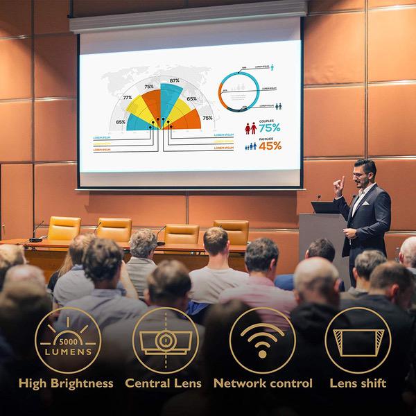 Make sure this fits by entering your model number. HIGH BRIGHTNESS: 5000 ANSI Lumens brightness makes it ideal for large screen applications HIGH IMAGE QUALITY: Full HD with a high native contrast ratio makes this projector highly visible for a user positioned anywhere. NETWORK CONTROL: Crestron, AMX and PJ-Link for network control via LAN, and RS-232 for up to 49 feet installations WIRELESS PRESENTATION SOLUTIONS: Optional and Cast Wi-Fi dongle wireless accessories