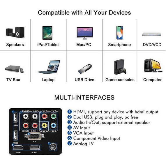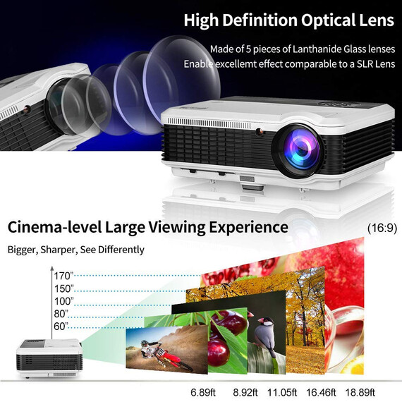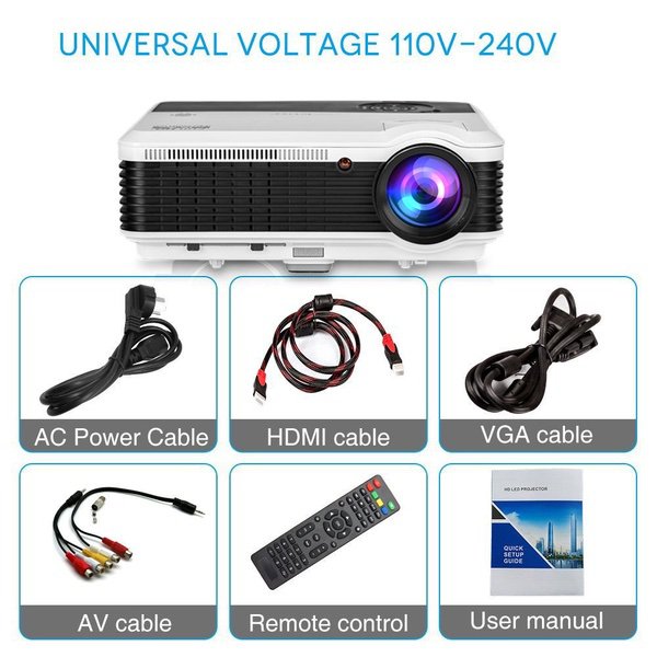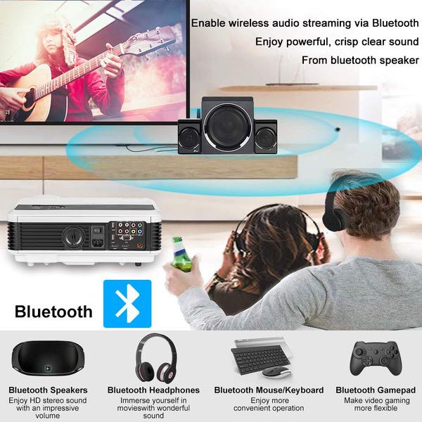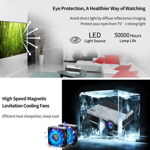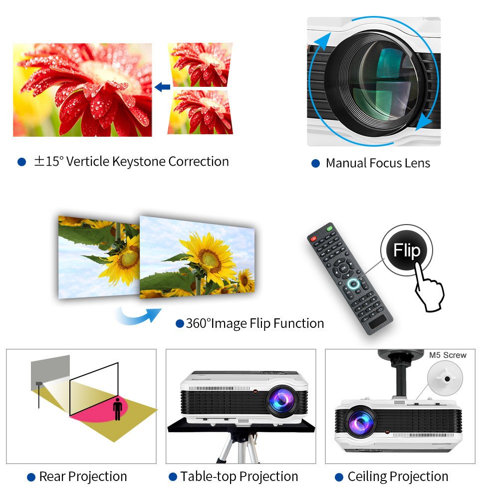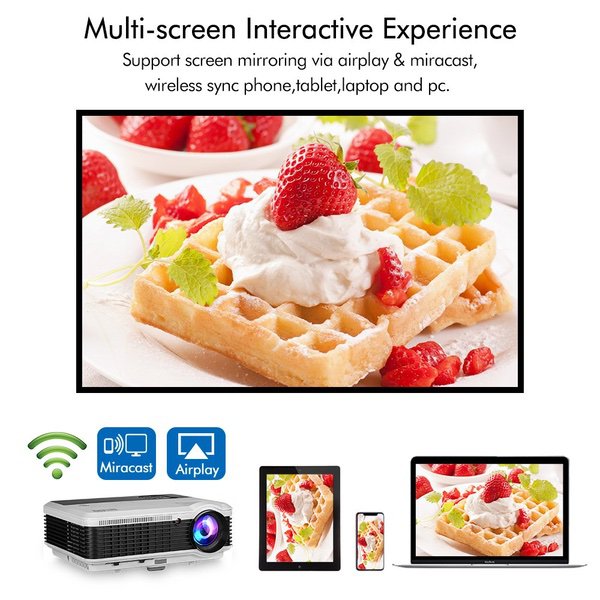 Make sure this fits by entering your model number. ◆ Wirelessly sync and cast movies/ games/ photo / video / music / slides from your iPhone/ iPad / Android Phone / Tablet / PC to the large screen via WiFi, no cable needed; Runs on the latest Android 6.0 OS with ARM CortexA7 Quad-core CPU&Powerful Quad-core Processor, stable and smooth to load online movies, pictures and games without without buffering; pre-load apps and offering large room for installing apps.You can expand the memory via USB (up to 32GB USB stick& 2 TB HDD). ◆ Enlarge the screen from 50 inches to 200 inches to have a totally different watching experience, image size can be adjusted from 6.5-21.8FT projection distance, support widescreen 16:9 and 4:3 display. Ultra-soft LED cold light source lamp, diffuse reflection projection light, unlike television direct light, you will not feel eyestrain after viewing. Built-in 5W stereo speakers, Dolby audio support, add speaker / headphones / home audio system via RCA audio out/ PC or BLUETOOTH. ◆ HD Display with High Resolution WXGA 1280x800 native, almost twice SVGA (800X600), inputs support: 1080P, 720P, 480P. A larger-than-life screen with 4600 lumens Brightness, 6500:1 contrast ratio, 16.7 million bright colors, bringing out sharp details and high fidelity color reproduction, breathe life into every image. TFT LCD screen, No Rainbow Effect. You will enjoy delightfully vivid images with crisp, deep blacks and well defined shadow detail of your favorite movies, TV, games. ◆ Easy to Use and Install: Equipped with 2 USB, 2 HDMI, VGA, Audio, AV, Video, ATV, hook up your smartphone, tablet, dvd/blueray player, ps3/ps4, xbox, wii, pc/laptop, roku, apple tv, usb flash drive, external hard drive, speakers, cable box etc. Comes with Free HDMI & VGA for fast connection. Refresh rate: 60Hz. Front/Rear projector, with ±15° vertical keystone correction, 360°Image flip function, M5 mounting holes for ceiling mounted installation. Voltage: AC 100-240V/50-60Hz. ◆ Optimized 50000 Hour LED lamp, Maintenance Free, no extra costs, no any loss in brightness as time goes by, working for above 17 years. Innovative cooling system increases airflow and reduce heat, avoid overheating. EUG has been specializing in LCD&LED&DLP Projector Manufacture since the inception in 2006, the EUG projectors have been sold all over the world. CCC,CE,FCC,PSE approved. All products have been strictly tested before we sell them! Warranty: 1 YEAR.