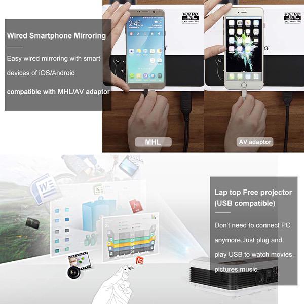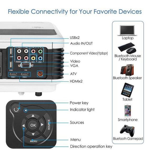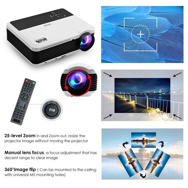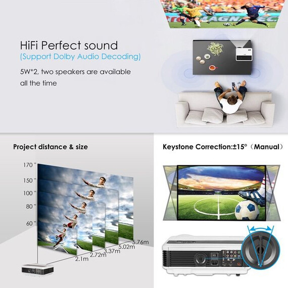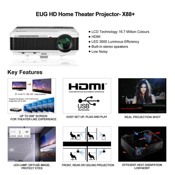 Make sure this fits by entering your model number. HD-QUALITY MOVIES AND GAMES: High Brightness-4600 Lumens with more concentrated pixels native resolution 1280*800, produce a delightfully vivid image with crisp, deep blacks and well defined detail, fill your screen with a bright image. Display 50-200 inches large screen from 6.9FT-21.8FT,. With powerful speakers built in, and 60HZ refresh rate and no warming up design ensure you no jam gaming and movie PROVIDE CONNECTIVITY to HIGH-DEF SOURCE: 2 HDMI inputs, VGA , Ypbpr,Composite Video, 2 USB and TV tuner.Compatible with Blu-ray, HD DVDs, DVDs, HDTV broadcasts, Newer video game consoles and computer games. Plug in your usb stick or use HDMI to get the clearest and sharpest image quality, with free HDMI cable.Support 1080P, 1080i, 720P, 576P, 480P, 576i,480i signals. SO EASY TO SET UP: Instant on/off, without having to go through that irritating Cooling period before you can cut the power.With ±15° manual keystone correction, you can correct images from distortion without any tilt. 25 degree ZOOM IN/OUT to fit your screen,and easier, faster and more exact and convenient to focus by simply rotating the lens. LED ILLUMINATION for LONG LIFE: LED Hybrid light source projector brightness increase,using dynamic enhanced RGB control technology than traditional dlp projector to better maintain the color fidelity.You can project your photos,movies and more in brilliant colrs for duration of 50,000 hrs. At the same time,lower power consumption down to 180W,which is energy saving and environment-friendly. Enjoy excellent reliability and service with EUG projectors. Internationally recognized standards for quality-Certificated by CE,FCC,Rohs,PSE,CCC.EUG Projector, a professional manufacturer over 10 years.12 months warranty,60-days return&refund. Come with top rated parts,fully test ensure the durability of the projectors. Professional and enthusiastic customer service is available for you 24 hours.