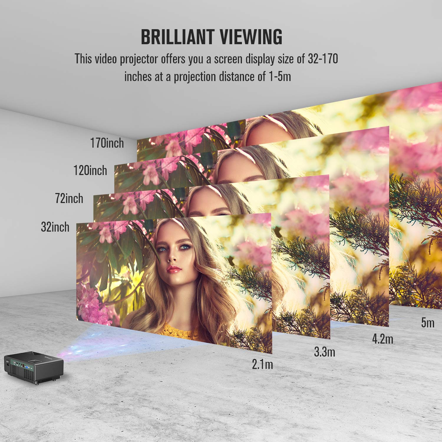 - Superior Home Theater Projector: video projector equipped with 2000: 1 contrast ratio, supported 1080p resolution, screen size from 32’’ to 170’’. Portable projector provides you with a premium home cinema experience with the bigger screen and clearer image