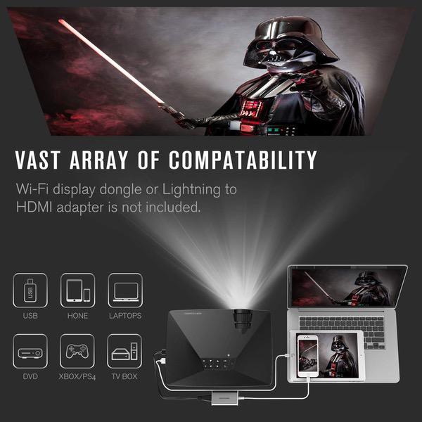 looks nice but also need to purchase additional cable to use with iPhone and MacBook. Compact size, bright lamp, looks like it will be a nice picture. But cant use until I receive additional purchased cables from Amazon. update; purchased and received the required cable from amazon.com and the projector still did not connect with either my iPhone or iPad. Maybe I needed the wireless dongle? but Im not going to keep trying anymore as I returned the projector.