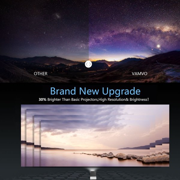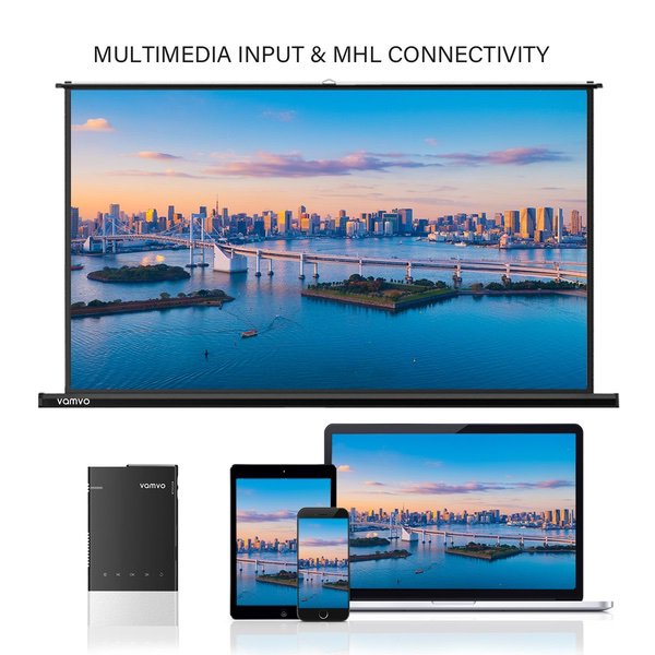 - MULTI-SCREEN SHARING ---- Vamvo mini projector adopts the latest Multi-screen technology. It supports AirPlay, DLNA, and Miracast technologies. You are able to project the screens of your iPhone, iPad, and other smartphones onto a 130”large screen (maximum) with a lightning cable, USB cable, or Type-C cable. This projector allows you to instantly project your mobile screen content onto the wall for your colleagues, friends, and family to watch.