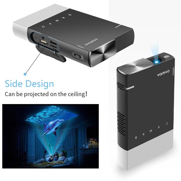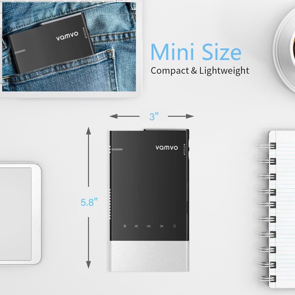 Mini Projector, Vamvo Ultra Mini Portable Projector 1080p Supported HD DLP LED Rechargeable Pico Projector with HDMI, USB, TF, and Micro SD Supports iPhone Android Laptop PC Projectors for Outdoor