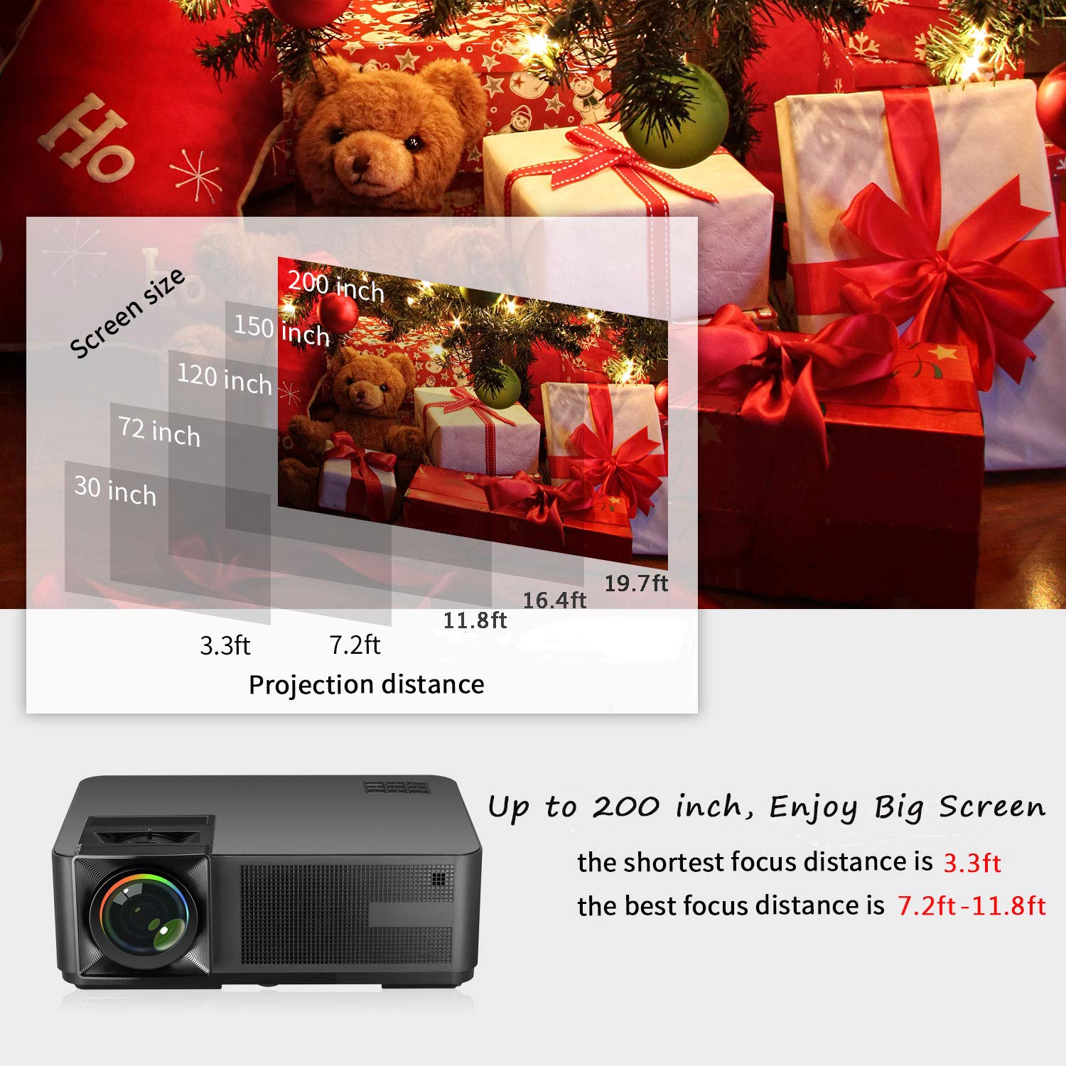 - 【 Enjoy Big Screen Home Theater 】: Projection size: 30-200 inches with projection distance 3.3ft - 19.7ft(1-6m), the shortest distance to focus is 3.3ft, and the optimal projection distance is 7.2ft, which will give you the best watching experience. The +/- 15 keystone correction function will ensure you get a clear display.