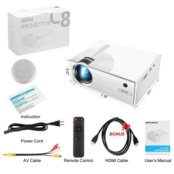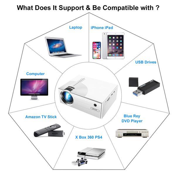 - ❤[Multimedia & Multi-Compatible Projector With Portable Size]: Queretek mini projectors compatible with smart phone (Android or iOS), laptop, tablets, Amazon Fire TV Stick and TV BOX, Game console such as PS4, X-Box ONE or Wii to enjoy BIG games. This portable projector is built in a variety of inputs interface, such as USB VGA and AV HDMI headphone jack. Free HDMI included.