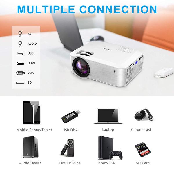 - 【MULTIMEDIA PORTABLE PROJECTOR】The photo projector is compatible with PC, laptop, iPad, iPhone and Android phones, Amazon Fire TV Stick, Chromecast, Xbox, and PS4. So this projector is fit for playing videos, TV series, photos sharing, football matches, etc.