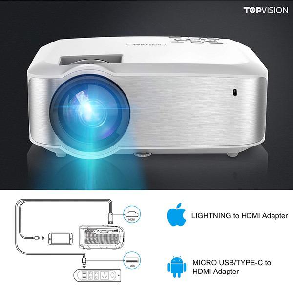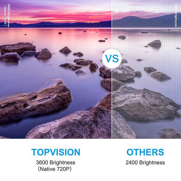 - 【3600 BRIGHTNESS LED VIDEO PROJECTOR】2019 upgraded TOPVISION mini projector is equipped with 3600 brightness LED light, native 1280×720 pixels resolution, 1080P supported and 2000:1 contrast ratio, delivers vivid and clear images. Ideal for Home Entertainment
