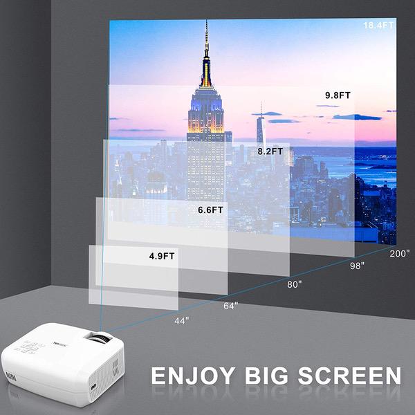 - 【BUILT IN HI-FI STEREO SPEAKERS】This HD movie projector is equipped with two HiFi Stereo Speakers. And there is a 3.5mm audio out. This movie projector provides a watching size from 32” to 200” with the projection distance between 4.9ft to 18ft. And the best viewing distance is 10 feet with 98 inch.