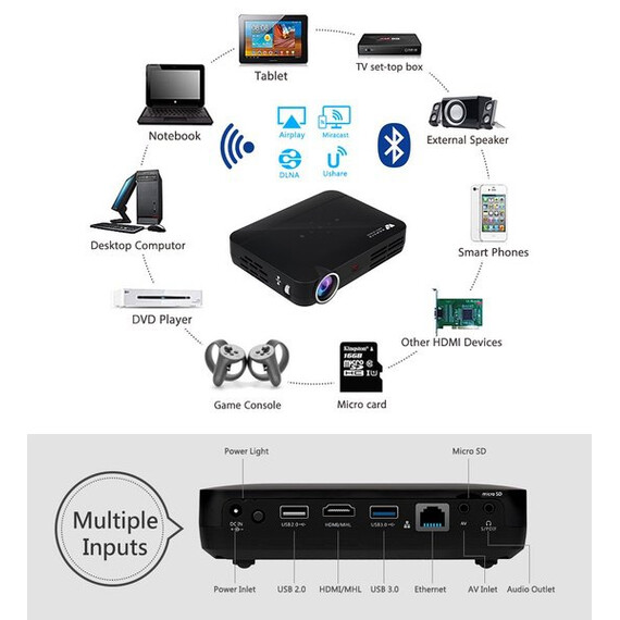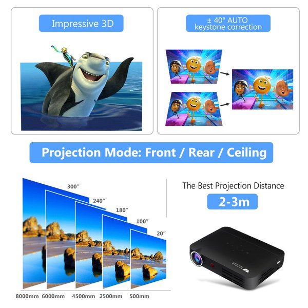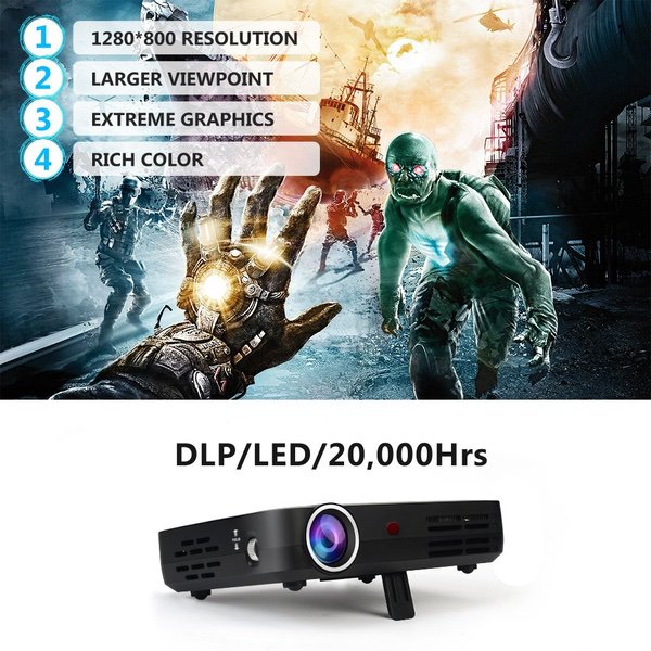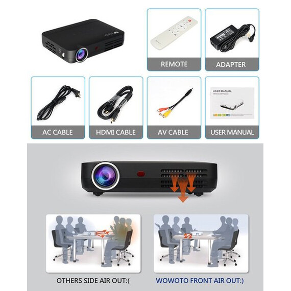 Make sure this fits by entering your model number. ★Advanced Configuration★ 1280*800 native resolution (WXGA), 3500 Lumens, Android OS, DLP technology, LED Lamp. Amazing 3D effect, supports 1080P input. Built-in Wi-Fi/Bluetooth/Speaker/Touch Control. Extensive Stable Wired Connection: HDMI*1, AV*1, USB2. 0*1, USB3. 0*1, Micro SD*1, RJ45*1 ★ ★Best Choice of Projector★ You can download and install apps you like and play it on the huge projection screen (up to 300”) Also can connect external speaker to enjoy music! Rich color and HD resolution provide the great visual feast. ★★★Update: The batteries for remote control won't be included in the package, because we're informed that shipping AAA batteries is dangerous. Please buy the AAA batteries separately. Thanks for your understanding. ★★★ ★Wireless Screen Share★ Smartphone resources can be shared through the huge screen by Airplay/Miracast/DLNA/Share. Project from your laptop, tablet, or smartphone without plugging into the projector, so you can move freely about the room, your business life will be convenient and professional. ★Compact Stylish Design★ Popular matte black brings stylish body. First Choice of Christmas gift. No larger than an iPad mini, lightweight only 0. 5kg. Easy to set up and enjoy with whole family right away! Touch Control is displayed on the top. Connect wired/wireless mouse to USB port or Bluetooth. When not in use, won’t take up much space. ★ and Service★ 20, 000 hours Long-lasting LED lamp does not have to be replaced for 7 years even if the projector is used 7-8 hours every day. Every DLP Projector from WOWOTO enjoys Full 12 months . WOWOTO professional after-sales team will response your any problems within 24 hours. ★Customer Service Available Before/On/After Christmas Day. ★