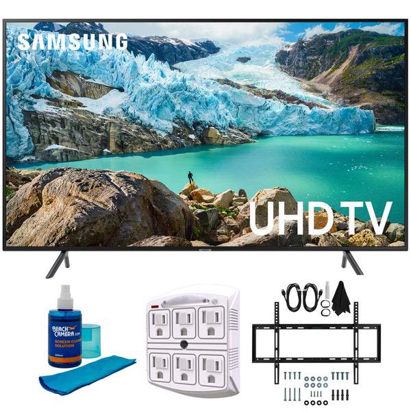 Samsung 50" RU7100 LED Smart 4K UHD TV 2019 Model (UN50RU7100FXZA) with Slim Flat Wall Mount Kit Ultimate Bundle for 45-90 inch TVs, Screen Cleaner for LED TVs & SurgePro 6-Outlet Surge Adapter